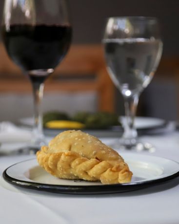 Otro detalle es que te reciben con una copa de espumante o de Campari de cortesía, junto a dos empanaditas de carne. Junto a la panera, esto justifica el cobro de servicio de mesa.