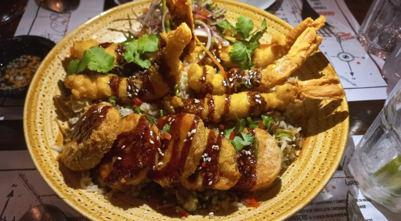 Y aún faltaba un plato contundente: chaufa nikkei, con tempura de langostinos y boniato con su salsa nikkei, sobre la base de arroz chaufa.