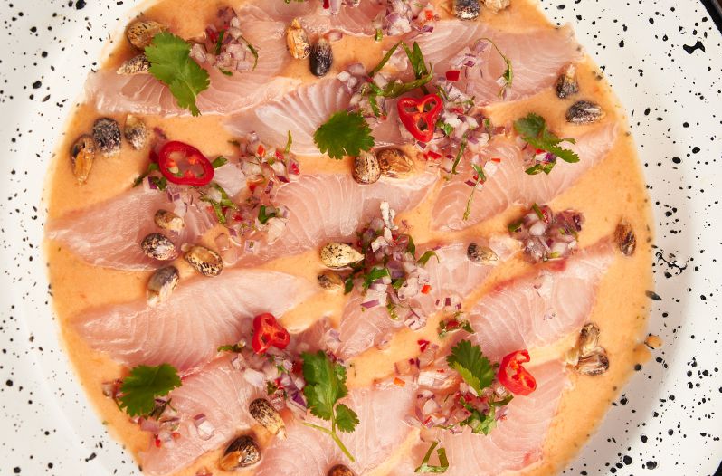 El tiradito «Chucuito» de pesca del día con leche de tigre cremosa, palta y oliva exhibía esa perfecta combinación entre color y sabor. Lo que se diría, una verdadera pinturita.