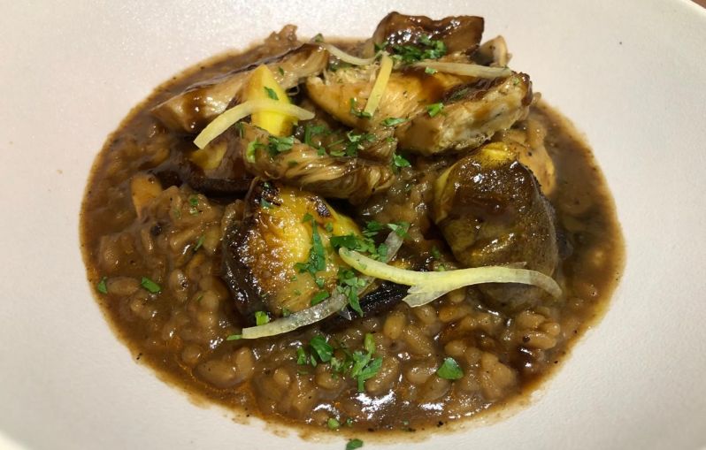 Se probó además en forma compartida el único plato sin «animales» entre los principales: arroz meloso de hongos, fondo vegano y limón encurtido.