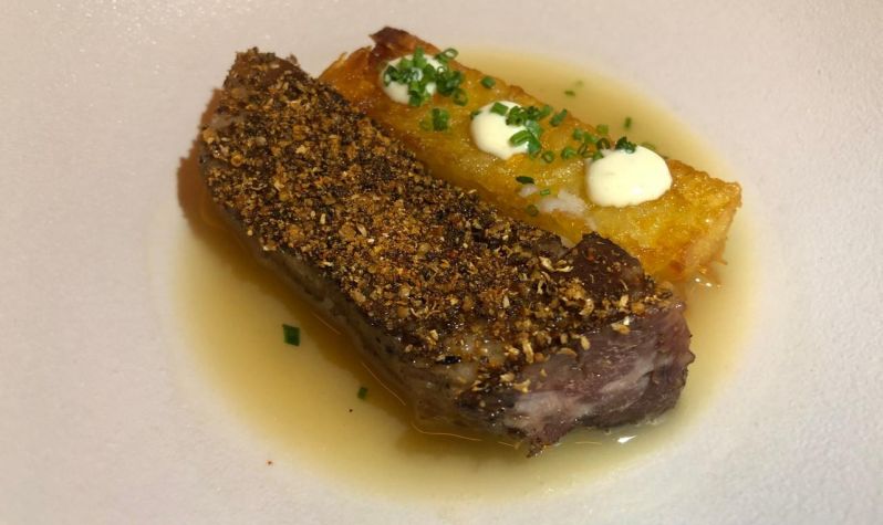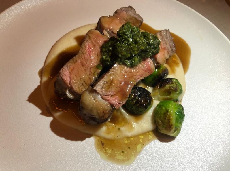 La parte de proteína está presente con el ojo de bife (mejor si muy jugoso), con puré de pallares y «chimikrein». Cuentan también con dos opciones de pescado: trucha con ñoquis al hierro, hojas y holandesa ligera; y pesca (en este caso era corvina negra) con crema de pimientos y ajo asado y repollitos marinados.