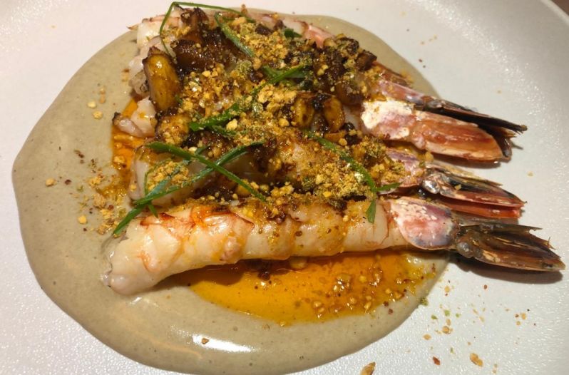 Pasamos luego a la sutileza de los langostinos a la «parri», sazonados con una vinagreta de maní y ajo negro. Y otro plato vegetariano: croquetas de coliflor, salsa de sésamo y hierbas.