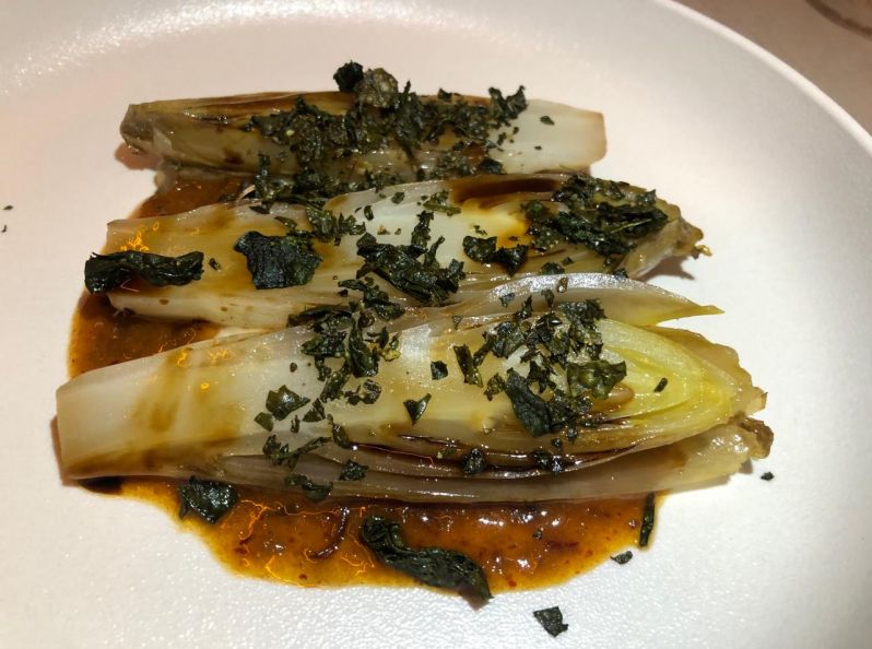 La segunda entrada consistió en tiernísimas rodajas de calamar, con guanciale, perejil y migas de castaña. Un plato sin proteínas animales muy sabroso, son las endivias grilladas, con puré de manzanas y vinagreta de kimchi, levemente picante y ácida.