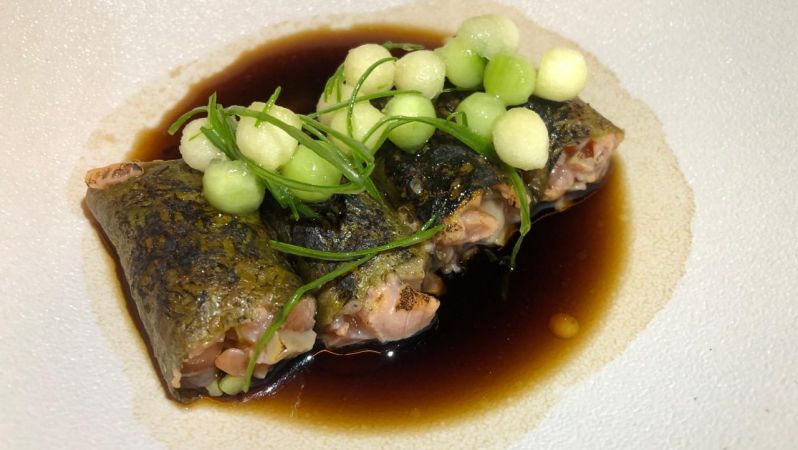 A saber: trucha curada con nori, salsa tosazu, esferas de manzana y pepino, un plato inspirado en la cultura oriental como los que el chef desarrolla en Namida.