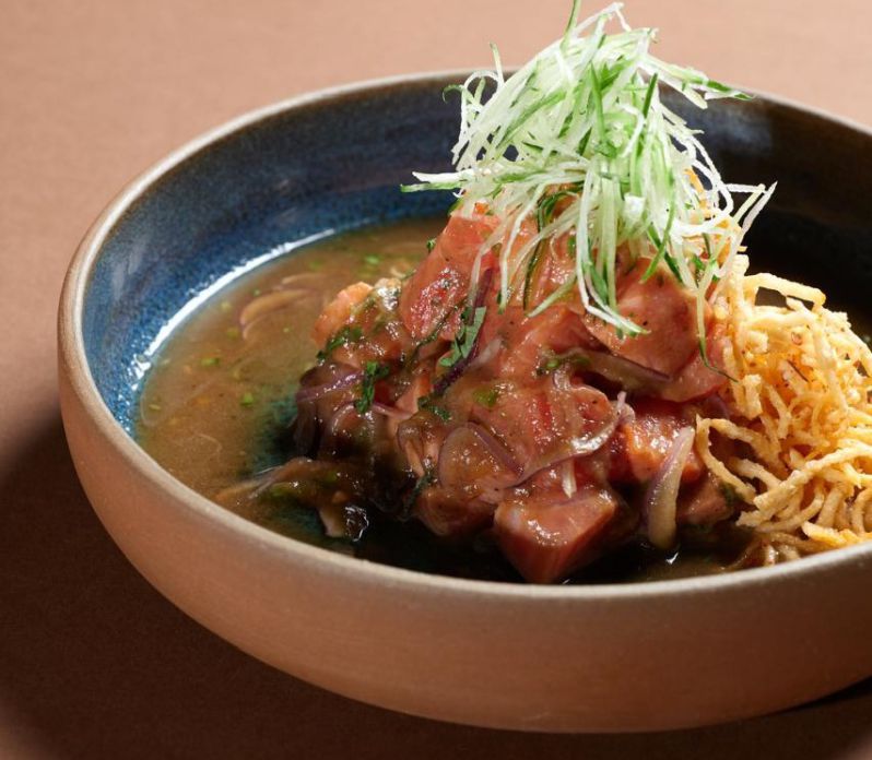 También el ceviche «Tamarindo», que sale con trucha, pepino, cilantro, rocoto, y cebolla morada. La salsa es cítrica agridulce de tamarindo, y se completa con crispy wonton.